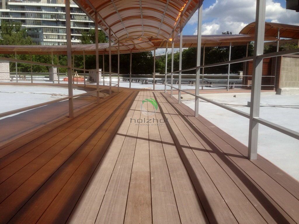 В бизнес-центре на "Войковской" (что на Ленинградском шоссе в Москве) выполнен монтаж переходов между корпусами офисных зданий на кровле. Дорожки выполнены из Универсальной доски из ДПК общей площадью 660 кв.м. Теперь для удобства сотрудников комплекса перейти из одного строения в другие два, занимает не более 1 минуты, а раньше приходилось "путешествовать" по этажам и многочисленным лестничным переходам через первые этажи зданий.